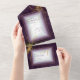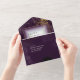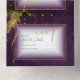 A watercolor background in shades of plum purple is topped by an abstract of fine gold lines and glittering lighting effects to create the pieces of this beautiful wedding suite. The combined wedding Invitation and RSVP card shown here also features off-centred text and a beautiful gradient frames to hold all your text. Easily add your own names, wedding date and event details using the provided template. Search ID867 to see other pieces and colour choices for this set.