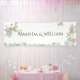 This exquisite wedding banner is adorned with an elegant floral motif featuring delicate roses and hydrangeas nestled among lush green leaves. The spouse names are printed using a classical serif font which further enhances the overall sophistication.