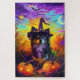 Embrace the Halloween spirit with this enchanting design featuring a cute dog in a witch hat surrounded by carved pumpkins. Perfect for adding a touch of spooky charm to your festive celebrations.