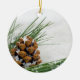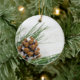 Fir cone sprinkled with snow flakes double-sided ceramic round Christmas ornament