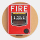 Photograph of a red fire alarm handle mounted on a wooden wall