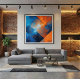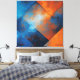 Geometric abstract art with diagonal panels in deep blue and vibrant orange. Texture resembling oxidized metal or reflected sky. Perfect for modern decoration and wall art. A sophisticated fusion of warm and cool colors in a dynamic composition that brings energy and style to any environment.