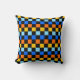 A vibrant chequerboard pattern featuring alternating rows of orange, yellow, light blue, and blue squares against a black background. The design is bold and energetic.