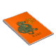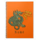 A vintage woodcut of a fire breathing dragon is coloured green. Background is orange. Your name or phrase in green below.