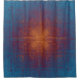 A gorgeous glowing hot concentric design with twirled ancient Greek column motifs, and symmetrical bars radiating from the centre point, burning from fiery orange, through deep royal purple to a light indigo blue.