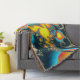 A quality printed throw has its advantages. This is a much finer weave throw than its loopier cousins, and though lighter, it is worth the investment for custom room accessorizing. The back is much prettier than the typical brown, and the fringe on the long sides very vivid, the selvage nicely done. Before photographing, I washed the throw in cold water, delicate, with a thicker woven throw the same size. On tumble dry low, this throw was dry in half the time as the other. This is a very practical quality if you use throws for furniture covers or to wrap up in frequently. The sleekness of the fabric makes it a great layer for accenting or protecting without the feeling of sitting on too much stuff. Perfect for napping or when you feel a light chill coming on. The color printing is beautiful and on this fabric, matched the design and color of my Photoshop image. This is an advantage for blending room fabrics and colors. The fringe on the short sides prints the colors from the design image and therefore varies from the side fringe. I streaked a white fractal line through the plaid pattern to give the illusion of weaving. This printed as crisp as an illusory thread, and put some white in the short side fringe, showing another advantage of print vs loomed- for artistic purposes, line lines, detail, and color integrity can be planned and preserved. My loomed throws have color limitations and more of a needlepoint texture. Print throws reproduce an exact image. The throw felt a little stiff straight out of the package, but this went away in the first delicate wash. Of course I searched the wash water for ink or bleeding and there was none.