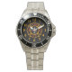 Has heft and feel of expensive stainless steel quartz watches. Good band with safety catch. I removed links, which is easy because engraved arrows show direction to push the linking pins. As always by this seller, the image (a railroad logo) is a perfect reproduction of my emailed image, and is precisely spaced and aligned.
