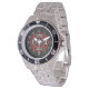 Has heft and feel of expensive stainless steel quartz watches. Good band with safety catch. I removed links, which is easy because engraved arrows show direction to push the linking pins. As always by this seller, the image (a railroad logo) is a perfect reproduction of my emailed image, and is precisely spaced and aligned.