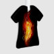 Bright peacock feather made of fire and flame on black background.
