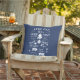 Personalised outdoor pillow lettered with Fire Pit Rules in handwritten typography. This navy blue and white hand lettered design is decorated with doodle drawings of a fire, marshmallow, fireflies and stars. Fire Pit Rules read "Gather around the fire pit, forget your worries, roast marshmallows, count stars, make happy memories, tell stories and stay til late, sing + dance + relax". The template is ready for you to add your custom text on the back, such as name(s) or family name and year established.