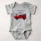 Adorable baby romper features a firetruck, and "I want to be a Fireman."