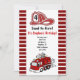 This cute birthday invitation features a cartoon fire hat on top and a fire truck with a penguin driver at the bottom The sides and back have a red and white striped pattern. You're little boy's name is in red while the rest of the text is black. You can even put your childs name inside the fire hat.