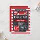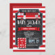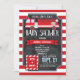 It's a boy! Cute, fun, fire truck theme baby shower invitation on elegant red and white stripes pattern. Features red, white, and grey fire truck. Great year round for spring, summer, fall, or winter firefighter, firetruck, fire truck, fireman baby showers.