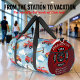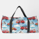 This duffle bag features a charming pattern of red fire trucks, fire hoses, and axes, set against a bright blue sky filled with fluffy white clouds. A side pocket, adorned with a red fire department emblem, is personalised with "FIRE RESCUE," "JENNY SAMSMITH," "FIRE DEPARTMENT," and "Vancouver B.C.," making it a thoughtful gift for a firefighter. Personalise with your name and department home town and more. monogram