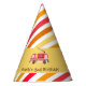 Celebrate your son's or daughter's birthday with this cute firetruck birthday party hat. Red Fire Engine is front and centre with birthday boy or girl's name and birthday below. Can easily be changed for your kiddo's first birthday (or any age!)