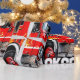 This is a pop-art style fire engine in a city-scape.