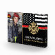 This design features a firemen's flag with black and white stripes, and a thin red line stripe as well. "Congratulations" and a fireman's badge sits above the name of the graduating firefighter.