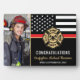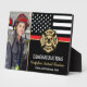 This design features a firemen's flag with black and white stripes, and a thin red line stripe as well. "Congratulations" and a fireman's badge sits above the name of the graduating firefighter. This design also works great for retiring firefighters, lieutenants, or chiefs. Celebrate in style with this customisable photo banner!