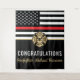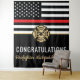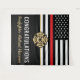 This design features a firemen's flag with black and white stripes, and a thin red line stripe as well. "Congratulations" and a fireman's badge sits above the name of the graduating firefighter. This design also works great for retiring firefighters, lieutenants, or chiefs. Celebrate in style!