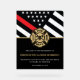 This design features a firemen's flag with black and white stripes, and a thin red line stripe as well. "Congratulations" and a fireman's badge sits above all of the party details for the retiring firefighter, lieutenant, or chief's retirement party.