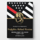 This design features a firemen's flag with black and white stripes, and a thin red line stripe as well. A fireman's helmet sits above all of the party details for the graduating firefighter. This design also works great for a retiring firefighter, lieutenant, or chief's retirement party.