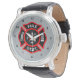 Masculine Malltese cross watch for firefighters and other emergency responders- Red, black, and white Maltese Cross shield against a grey, brushed metal look background. Black clock face numbers. Awesome birthday gift for firefighters or fireman gift for graduation. Nice retirement gift for fire chief, too!