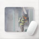 A mouse pad featuring a photo of a firefighter battling a house fire.