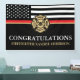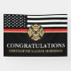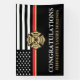 This design features a firemen's flag with black and white stripes, and a thin red line stripe as well. "Congratulations" and a fireman's badge sits above the name of the graduating firefighter. This design also works great for retiring firefighters, lieutenants, or chiefs. Celebrate in style!