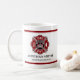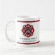 This elegant Firefighter Red Maltese Cross Fire Department Two-Tone Coffee Mug is customisable with Name and Station or Rank. Add personalised name and station to make it truly unique. This mug features a maltese cross with ladder and fire hydrant icon, along with FIRE DEPARTMENT on top and bottom with thin red line on top and bottom of mug, with a firetruck on black circle. Perfect for gift ideas and everyday use.