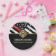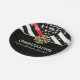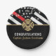 This paper plate design features a firemen's flag with black and white stripes, and a thin red line stripe as well. "Congratulations" and a fireman's badge sits above the name of the graduating or retiring firefighter, lieutenant, or chief. Celebrate in style!