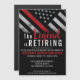 This design features a firemens flag with black and white stripes, and a thin red line stripe as well. "The Legend is Retiring" text sits above all of the party details for the retiring firefighter, lieutenant, or chief.