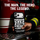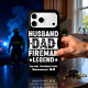A firefighter stands confidently wearing a shirt that proudly announces his roles as a husband and dad, celebrating the heroic journey of being a firefighter. The atmosphere radiates warmth and pride, highlighting family and service.