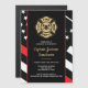 This design features a firemen's flag with black and white stripes, and a thin red line stripe as well. A fireman's badge sits above all of the party details for the retiring firefighter, lieutenant, or chief's retirement party.