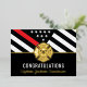This design features a firemen's flag with black and white stripes, and a thin red line stripe as well. "Congratulations" and the fireman's badge text sits above the name of the graduating or retiring law enforcement firefighter, lieutenant, or chief's graduation or retirement party details. Celebrate in style!