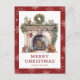 Elegant Merry Christmas postcard showcasing a cosy fireplace adorned with a festive wreath, garland, and hanging stockings