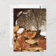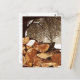 This postcard features a pile of firewood. The wood is stacked in the shed. Beyond the woodpile is a cold, snowy wintry scene.