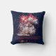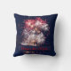 Fireworks 4th of July Independence Day cotton throw pillow. 'Happy 4th Of July' phrase. Be patriotic and celebrate America with this beautifully designed trendy, modern living room decor. Celebrate in style with this awesome design. Red white and blue colours. Image copyright Marg Seregelyi Photography.