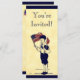 An invitation templates with retro letters and vintage Americana 4th of July art with a patriotic boy holding red holiday fireworks and an old US flag on a faux parchment background. Add your own date and info for your big Independence Day celebration!