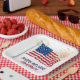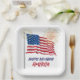 American flag with "Happy Birthday America" text and gold fireworks on white.