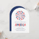 These elegant and fun red white and blue Independence Day party invitations feature red and blue fireworks and stars, and modern text that says "America." The invitation as shown is an an arch shape, but you can easily change the shape as well as the wording to reflect your own type of patriotic Fourth of July celebration.