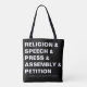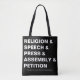 Stylish tote bag listing the freedoms granted by the First Amendment. Available in white or black.