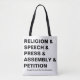 Stylish tote bag listing the freedoms granted by the First Amendment. Available in white or black.