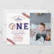 Baseball First Birthday Party Photo! Celebrate your little rookie with this fun and unique birthday design, created with traditional style baseball background with "ONE" that has a baseball in place of the "O". Customise the text for your party and photo for a special touch to your child's special day with these art birthday party invitations!