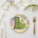 Grinning green dinosaur is celebrating your child's first birthday! Personalise and add your baby's name. Matching birthday party items are available!