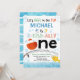 O-fish-ally one birthday invitation, perfect for a fishing theme celebration. Features bold typography, bubbles, gold fish, red bobber, fish hooks, and water elements.