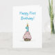 First birthday religious card. Baby's first birthday cupcake and candle original artwork design done in colour pencil and pen. Blue text on the front reads, "Happy First Birthday!" and the inside thanks God for the blessing of a year of joy with this precious child.