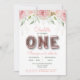 Sweet and pretty with rose gold balloons spelling out the word 'ONE'. This invitation has a decorative rose and foliage banner with glittered outlined foliage. Handpainted watercolor roses and leaves in shades of pink and green. Easily edit the template to your child's name and birthday party details. The card reverse has a rose and foliage repeating pattern.