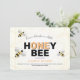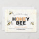 A first birthday party invitation with a honeybee theme. The invitation shows three bees and an abstract honeycomb shapes background.
