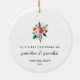 This simple yet stylish holiday ornament says "first Christmas as grandma and grandpa" along with their names and year in modern text and script. An elegant red and white Christmas floral bouquet with poinsettias and green leaves decorates the white background. A gorgeous keepsake for anyone who first welcomed a grandchild this year!