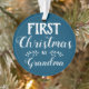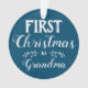 The caption reads "First Christmas as Grandma" in modern white lettering on an elegant blue background. The back is easily customisable with the baby's picture, with name and date of birth.